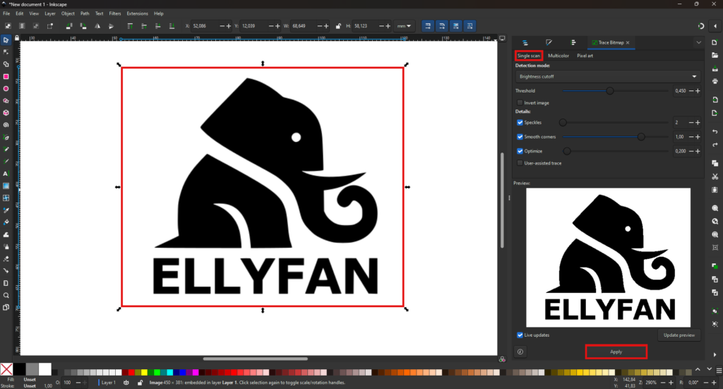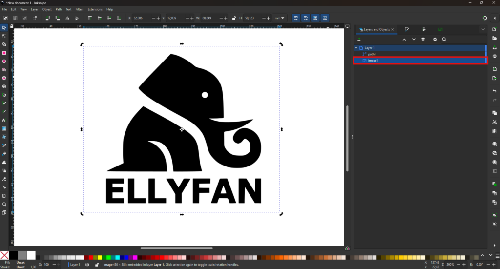 Po potrditvi (ko kliknete gumb ‘Apply’) Inkscape ustvari novo vektorsko obliko, ki se pojavi neposredno nad izvorno sliko.